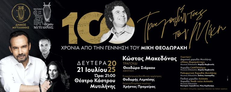 Ξεκινά σήμερα Δευτέρα 21 Ιουλίου το 2ο Μουσικό Φεστιβάλ του Δήμου Μυτιλήνης, το οποίο θα διαρκέσει έως και την Κυριακή 3 Αυγούστου και είναι αφιερωμένο στα 100 χρόνια από τη γέννηση του εμβληματικού μουσικοσυνθέτη Μίκη Θεοδωράκη.